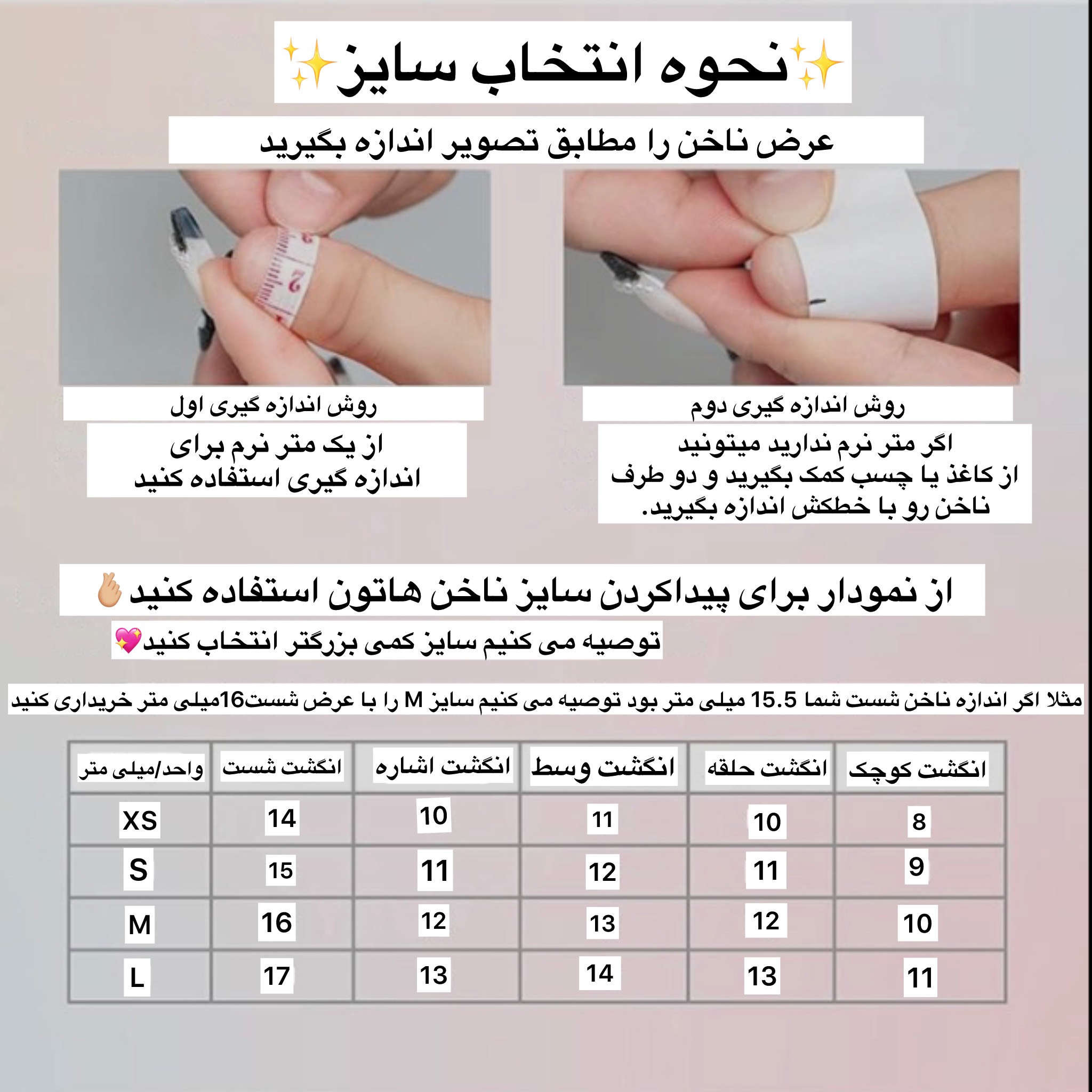 با کمک "جدول اندازه گیری" که در سایت هست؛ ناخن هاتونو سایز می کنید و متوجه میشید ناخن هاتون چه سایزی هستن و موقع خرید هر محصول سایز ناخنتون رو انتخاب می کنید و همون سایز براتون ارسال میشه.